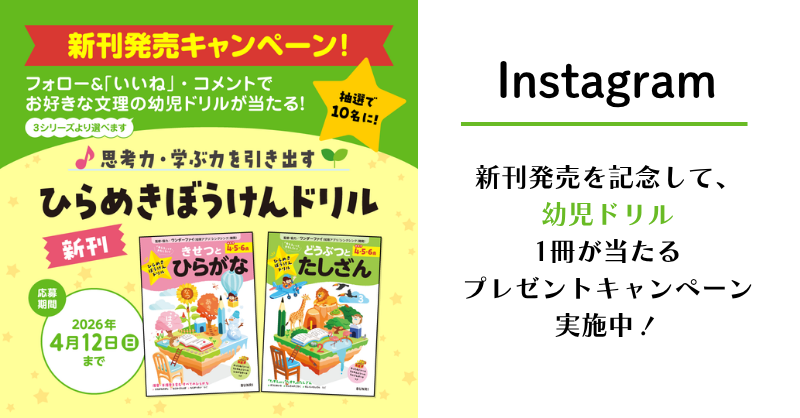 【公式】パパママ応援隊!アカウント(@bunri.official)をフォローして、 「ひらめきぼうけんドリル」のキャンペーン投稿に対して「いいね」と「コメント」をしてくださった方の中から、 抽選で10名の方にお好きな文理の幼児教材1冊をプレゼント プレゼント 当選者に後日DMで欲しい教材をお尋ねさせていただきます。 下記から1点お選びください。 ①「ひらめきぼうけんドリル」シリーズ(2点)から1点 ②「ふしぎはっけん! たんきゅうブック」シリーズ(2点)から1点 ③「文理の幼児ドリル」シリーズ(22点)から1点 応募方法 STEP1:文理【公式】パパママ応援隊!アカウント(@bunri.official)をフォロー STEP2:投稿に「いいね」 STEP3:投稿に対してコメント Instagram(@bunri.official) 応募締切 2026年4月12日(日)23:59 抽選・発表 ・応募期間終了後、抽選によって当選者を決定いたします。 ・当選発表は2026年4月中旬ごろ、当選された方へのInstagramのダイレクトメッセージ(DM)をもってかえさせていただきます。 ・応募者ご本人様の都合により当選の連絡ができない場合、また当選の連絡後に2日以内にご返信がない場合は、当選を無効とさせていただきます。 ・「なりすましアカウント」にご注意ください。 ・プレゼントの発送は4月下旬頃を予定しております。なお、プレゼントの発送は国内に限定させていただきます。 ※Instagramの文理【公式】パパママ応援隊!アカウント(@bunri.official)以外のアカウントからDMをお送りすることは一切ございません。 ※当選者様にクレジットカード番号や暗証番号等をお聞きすることはございません。 ※なりすましアカウントと思われる不審なDMを受け取った場合は速やかにそのDMを削除し、被害防止のために当該アカウントのブロックをお願いいたします。 お問い合わせ 下記フォームからお問い合わせください。 お問い合わせ 応募規約 文理 「ひらめきぼうけんドリル」発刊キャンペーン 規約 ■募集期間2026年4月1日(水)~2026年4月12日(日)23:59迄 ■応募資格利用規約に同意していただいた日本国内に在住の方ならどなたでも応募可能です。(Instagramの利用制限に則り、13歳未満の方からのご応募はお断りしております) ■応募方法 STEP1:文理【公式】パパママ応援隊!アカウント(@bunri.official)をフォロー STEP2:投稿に「いいね」 STEP3:投稿に対してコメント ■プレゼントの内容当選者10名の方に文理発刊の下記幼児教材の中からいずれかをプレゼントいたします。(当選された方にプレゼントをお選びいただきます)。 ①「ひらめきぼうけんドリル」シリーズ(2点)から1点 ②「ふしぎはっけん たんきゅうブック」シリーズ(2点)から1点 ③「文理の幼児ドリル」シリーズ(22点)から1点 ■当選およびプレゼントの発送について 応募期間終了後、抽選によって当選者を決定いたします。 当選発表は2026年4月中旬ごろ、当選された方へのInstagramのダイレクトメッセージ(DM)をもってかえさせていただきます。 応募者ご本人様の都合により当選の連絡ができない場合、また当選の連絡後に2日以内にご返信がない場合は、当選を無効とさせていただきます。 「なりすましアカウント」にご注意ください。 プレゼントの発送は4月下旬頃を予定しております。なお、プレゼントの発送は国内に限定させていただきます。 ※Instagramの文理【公式】パパママ応援隊!アカウント(@bunri.official)以外のアカウントからDMをお送りすることは一切ございません。 ※当選者様にクレジットカード番号や暗証番号等をお聞きすることはございません。 ※なりすましアカウントと思われる不審なDMを受け取った場合は速やかにそのDMを削除し、被害防止のために当該アカウントのブロックをお願いいたします。 ■個人情報の取り扱いについてキャンペーンにご応募いただいた時点で、株式会社文理(以下、「当社」といいます)の定める個人情報保護方針にご同意いただいたものとみなします。詳しくは、当社の定める「個人情報の取扱いについて」(https://www.bunri.co.jp/privacy)をご覧ください。 ■本キャンペーンに関するお問い合わせInstagramの文理【公式】パパママ応援隊!アカウント(@bunri.official)のDMにてお申し出ください。なお、プレゼントに関するご質問、当選に関するお問い合わせにはお答えいたしかねます。 ■その他注意事項 Instagramアカウントをお持ちでない方は、アカウントを新規作成の上、ご投稿ください。 本キャンペーンは株式会社文理が実施するものであり、InstagramおよびMeta社が後援・支持・運営するものではありません。 ご応募はお1人様1回とさせていただきます。複数のアカウントを作成して応募した場合、またはその疑いがある場合、当選を無効とさせていただきます。 本キャンペーンに関連して提供いただく情報は、Instagramではなく株式会社文理に提供されます。 非公開(鍵付き)アカウントの方は、フォローやコメントの状態が確認できない、あるいは当選連絡(DM)が届かない場合があるため、抽選対象外となる可能性がございます。あらかじめご了承ください