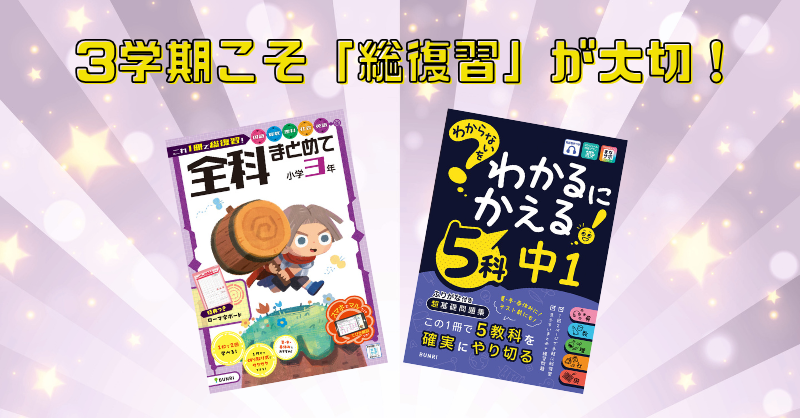 3学期は、1年の中でも少し特別な学期です。授業日数は短いのに、学年のまとめ・次の学年への準備が一気に進みます。 「もうすぐ進級だけど、このままで大丈夫かな?」「苦手なところ、実はそのままになっているかも…」 そんな不安を感じる方も多いのではないでしょうか。だからこそ、3学期は“新しいこと”よりも“総復習”が重要なのです。 もくじ なぜ3学期に総復習が必要なの? 総復習は、文理のドリル・問題集で! 3学期は「できなかった」を「できる」にするための時間 なぜ3学期に総復習が必要なの? つまずきは、後になるほど大きくなる 国語や算数・数学、英語などは特に、「前に習った内容を理解している前提」で次の学習が進みます。 そのため、わからないまま放っておくと、たとえば ・分数があいまいなまま → 割合がわからない・英単語が定着していない → 単語の意味がわからず長文が読めない などのように、進級した時に困ってしまいます。 3学期は、こうした小さなつまずきを見直す最後のチャンスです。 次の学年は「前学年の復習」から始まらない 新学年になると、授業はどんどん新しい内容へ進みます。 だからこそ、今の学年の内容は、今のうちに整理しておくことが大切です。 テスト・入試・内申にも直結する 中学生にとって、3学期は、学年末テストや内申点にも関わる大切な時期です。「なんとなくわかる」ではなく、説明できる・解けるレベルまで理解しているかが問われます。 総復習は、文理のドリル・問題集で! 「3学期に総復習することが重要なのはわかったけれど、 何から手をつけていいかわからない…」という人もいると思います。 1年間で習う範囲は広いので、すべてをもう一度やり直すというのはとても大変ですし、現実的ではありません。 そんな時には、全教科の学習内容の重要ポイントが1冊に詰まったドリルや問題集がおすすめです。 小学生には「全科まとめて」がおすすめ 小学生の総復習にぴったりなのが、「全科まとめて 」です。 1冊に全教科・全範囲を収録 1・2年生は国語・算数・生活、3~6年生は国語・算数・理科・社会・英語を収録しています。 1回1枚切り取り式 ドリルが分厚いとやる気を維持するのが大変ですが、1枚ずつなら無理なく頑張れます。 裏面でもう1回チャレンジ 表面と裏面に同じ問題が掲載されています。 時間をおいて再チャレンジすることで、苦手の発見や克服ができます。 スマホでさっと解答確認! 丸つけらくらく 小学校低学年の場合、保護者が丸つけをしてあげる必要があるかもしれません。 誌面の二次元コードを読み取ると、スマートフォンでさっと「答えとてびき」を確認して、丸つけができます。 ▶シリーズページはこちら ▶ご購入はこちら 中学生には「わからないをわかるにかえる5科」 中学生の総復習には、「わからないをわかるにかえる5科」 がおすすめです。 1冊での1年間の5教科の勉強をやり切れる 各教科の基礎的で重要なポイントだけに絞って掲載しています。5教科が1冊にまとまっているので、1年間で学ぶ内容を確実にやり切ることができます。 1回2ページで無理なく進む! だから1冊やり切れる! 左ページで要点を確認し、右ページの練習問題で内容を確認します。この2ページで1単元が終わるため、無理なく最後まで取り組みやすいです。 わかりやすい説明と豊富なイラストですいすい解ける! 重要事項や解き方のポイントひとつひとつについて、むずかしい言葉を使わずに、親しみやすいイラストとともにわかりやすく解説しています。重要語句はすべてふりがなつき・問題のヒントも豊富で、つまずかない工夫が満載です。 楽しい特集ページあり! 教科ごとに、パズルやクイズなどの楽しい特集ページもあります。 学習計画を自動作成!スケジュール作成アプリ付き 「とりくむ本」「期間」「がんばる度」「範囲」を入力するだけで、学習計画を自動作成してくれるスケジュールアプリが付属しています。 ▶シリーズページはこちら ▶ご購入はこちら 3学期は「できなかった」を「できる」にするための時間 3学期は、短いからこそ使い方が重要です。 ・苦手を放置しない ・今の学年の内容を整理する ・自信を持って次の学年へ進む そのための総復習として、「全科まとめて」「わからないをわかるにかえる5科」を活用してみてください。 3学期の取り組みが、次の1年のスタートを大きく変えます。 【今回の執筆者】しーば【プロフィール】学生時代、好きだった教科は国語と社会です。古典の漫画とか、歴史のドラマとかで勉強(?)していました。全体の流れがわかるのでおすすめです! 好きな動物は、柴犬。柴犬カフェで癒されたい。
