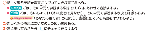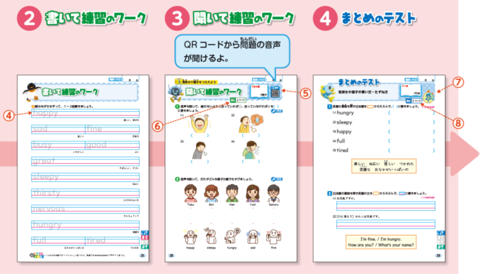 もしこれまで学習した簡単なあいさつなどに少し不安が残る場合は、秋からのご購入でも、ぜひ夏休み前の単元を復習してみましょう!