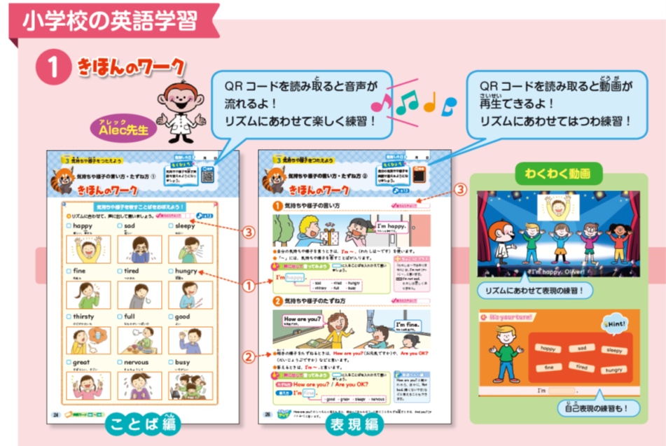 小学校の活動のように、音声や動画で楽しく単語や表現を学べます。