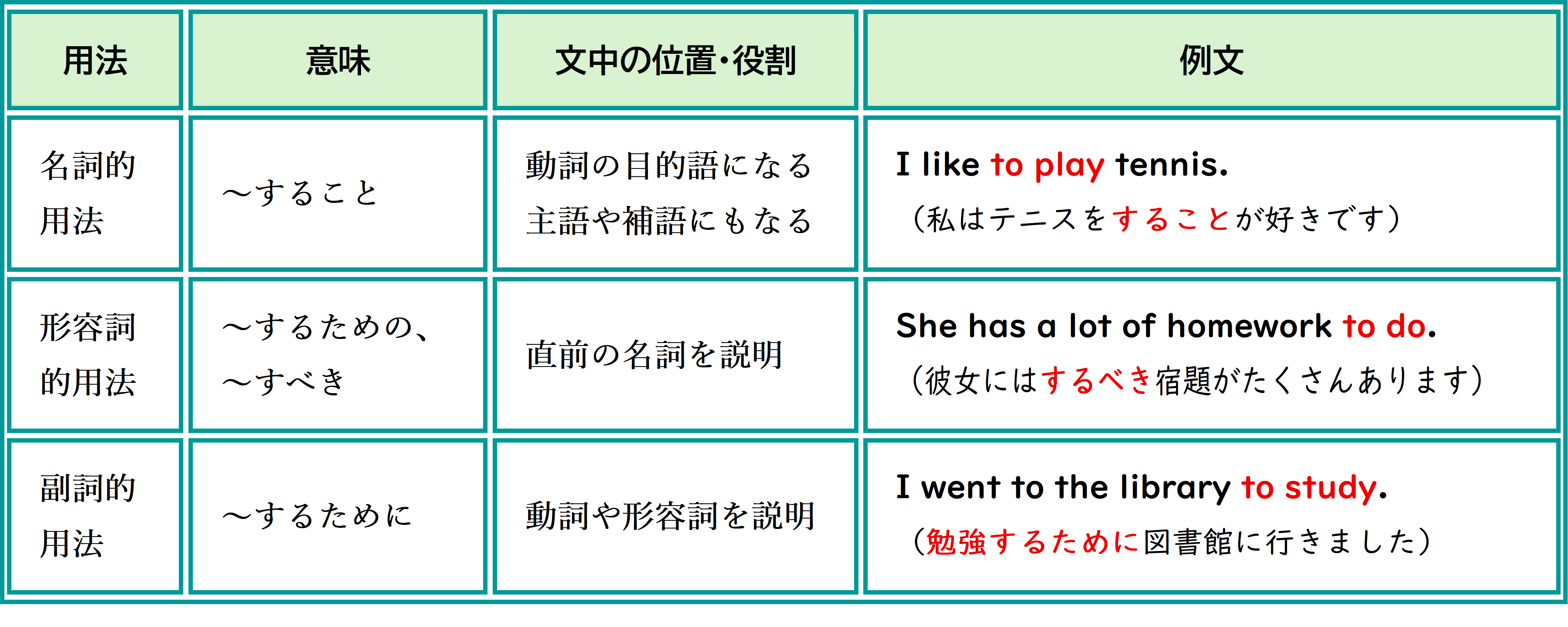 不定詞は「~すること」「〜するための」「~するために」などの幅広い使い方をします。