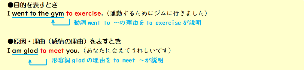 不定詞が後ろから動詞や形容詞を説明します。