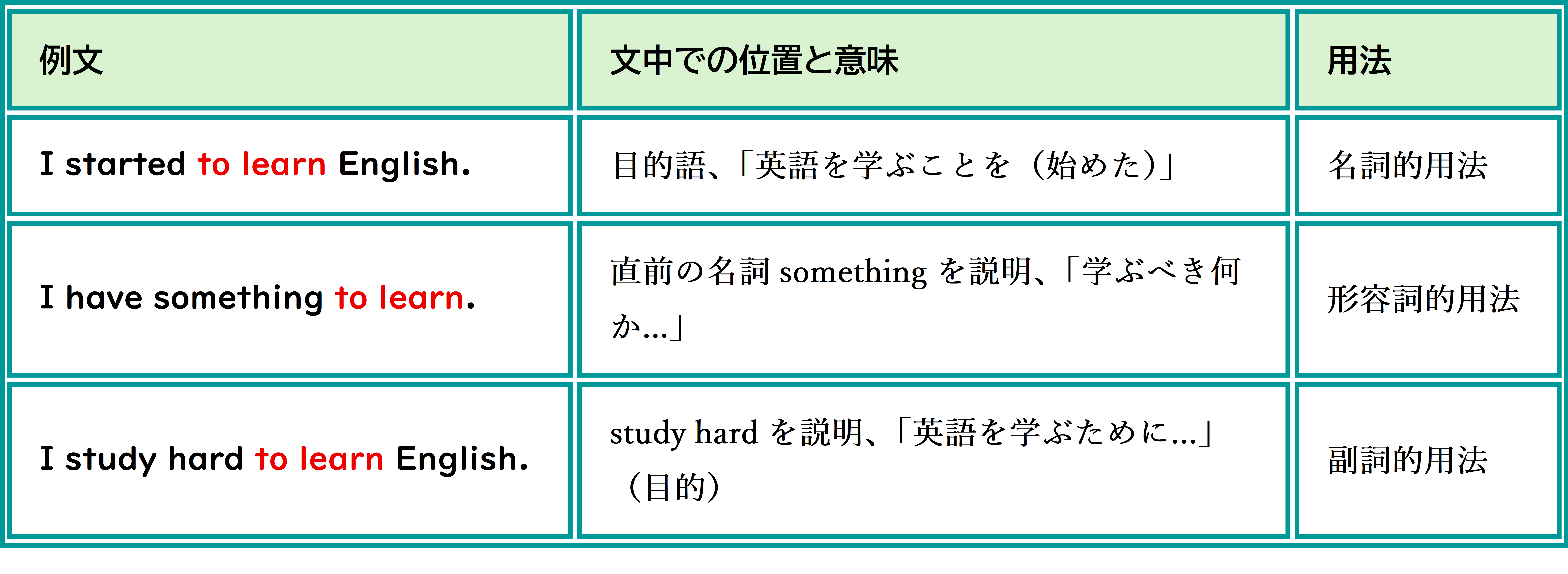 〈to + learn〉を例に、文中の位置によって用法が変わる例を見てみましょう。