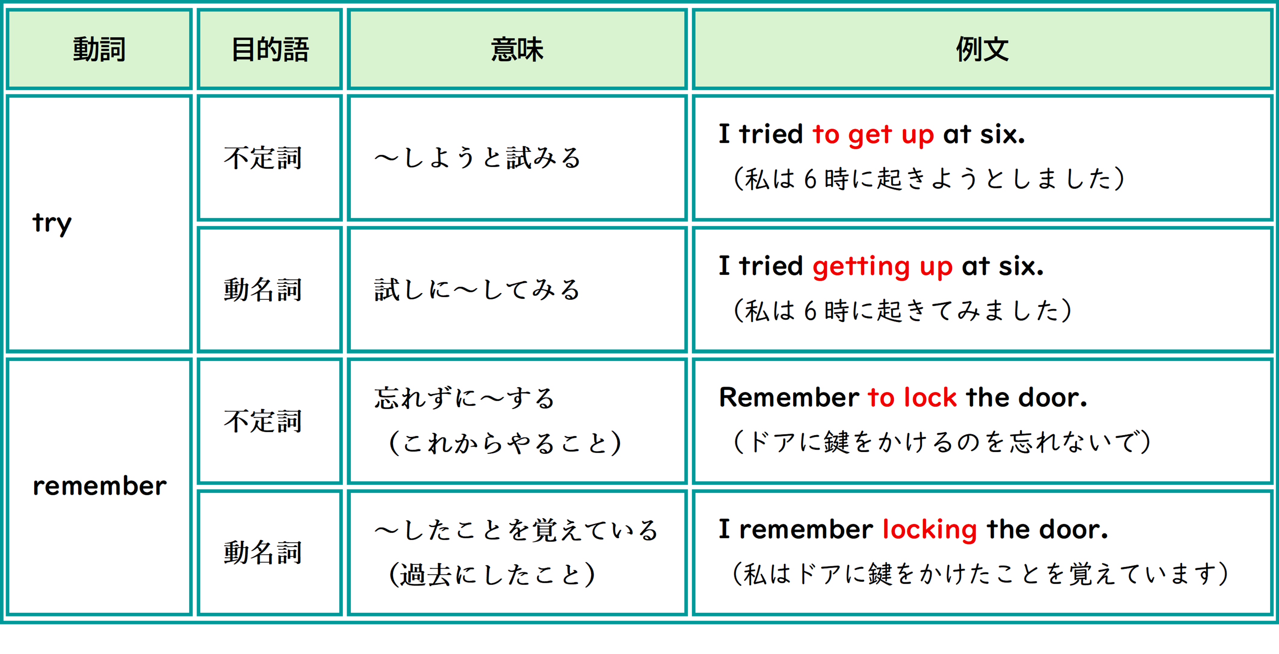 try、remember、forgetなどはどちらを目的語としてとるかで意味が異なるので要注意です。