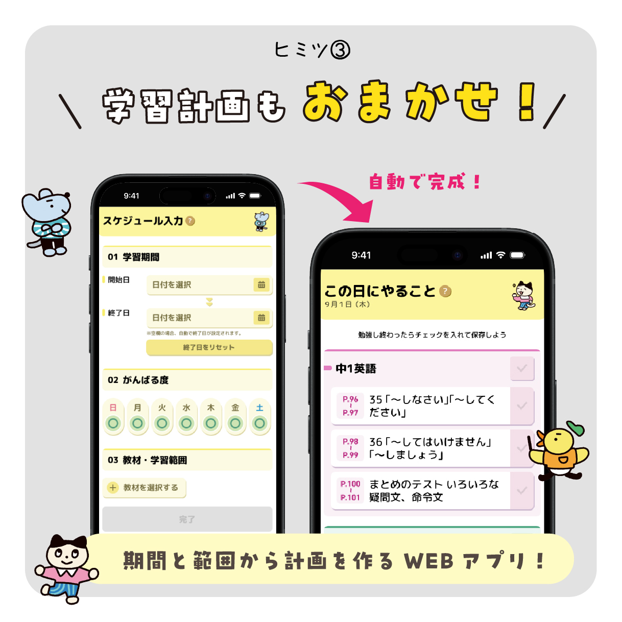 「とりくむ本」「期間」「がんばる度」「範囲」を入力するだけで、キミだけの学習計画のできあがり!