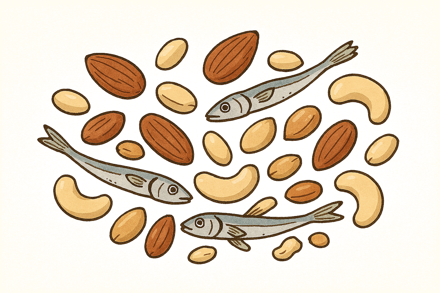 甘いお菓子だけでなく、体にもやさしいおやつ、ナッツや小魚も取り入れたいところ。