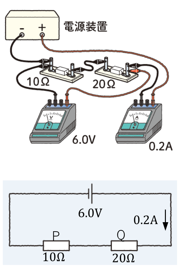 り、P、Qのどちらにも0.2Aの電流が流れるので、オームの法則を用いると、