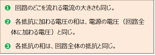 直列回路では、次ののことがらが成り立ちます。