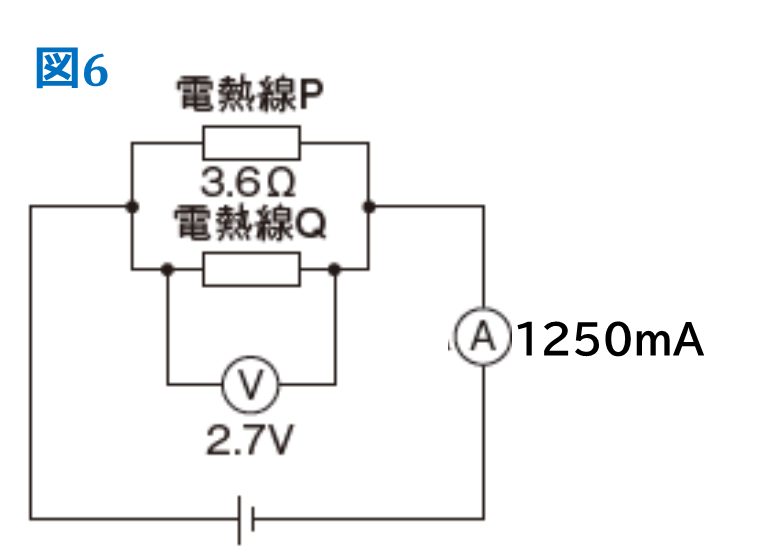 図6のように、3.6Ωの電熱線Pと抵抗のわからない電熱線Qを並列につないだ回路に電圧を加えたところ、電流計は1250mAを示し、電熱線Qには2.7Vの電圧が加わった。