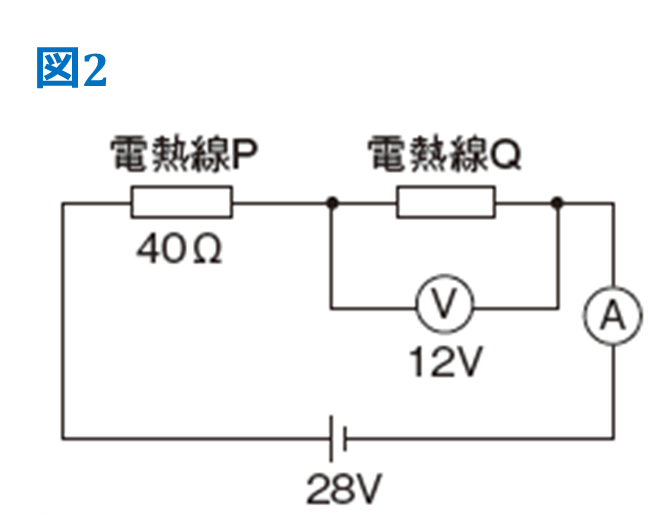 図2のように、40Ωの電熱線Pと抵抗のわからない電熱線Qを直列につないだ回路に、28Vの電圧を加えると、電熱線Qには12Vの電圧が加わった。