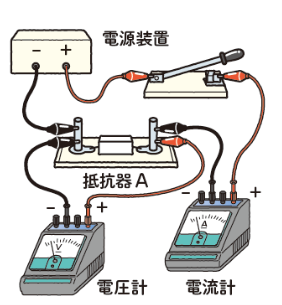 たとえば、右下の図のように、抵抗器(電熱線と同じような性質をもつ電気器具)にいろいろな大きさの電圧を加え、流れる電流の大きさを測定してみます。
