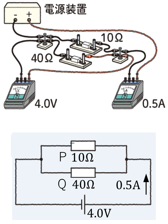 両方の電流をたすと、0.4〔A〕+0.1〔A〕=0.5〔A〕となり、PとQに枝分かれする前の電流の大きさと同じになります。→