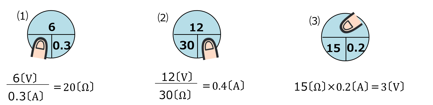 〔V〕=15〔Ω〕×0.2〔A〕、 ▢=15×0.2=3〔V〕
