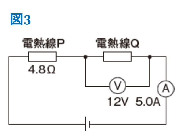 図3のように、4.8Ωの電熱線Pと抵抗のわからない電熱線Qを直列につないだ回路に電圧を加えたところ、電流計は5.0Aを示し、電熱線Qには12Vの電圧が加わった。