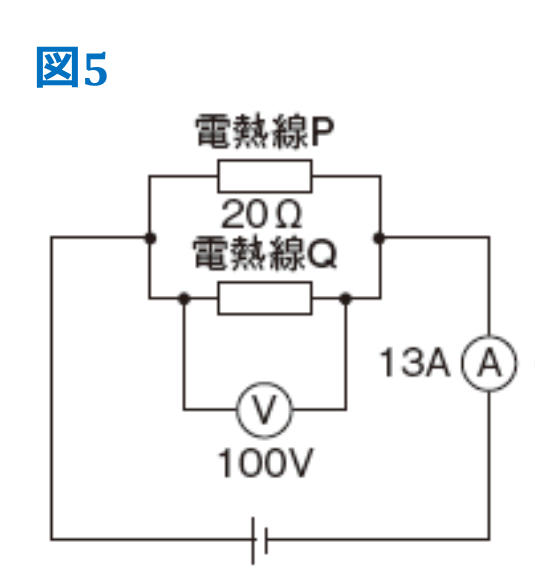 図5のように、20Ωの電熱線Pと抵抗のわからない電熱線Qを並列につないだ回路に電圧を加えたところ、電流計は13Aを示し、電熱線Qには100Vの電圧が加わった。