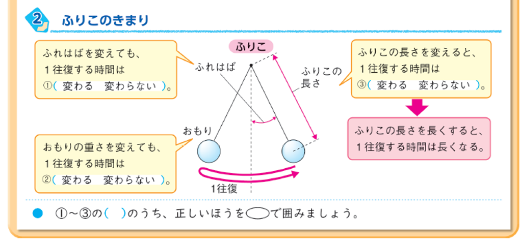 紐の長さ・重さ・振れ幅を変えて、振り子の周期を調べる学習をします。
